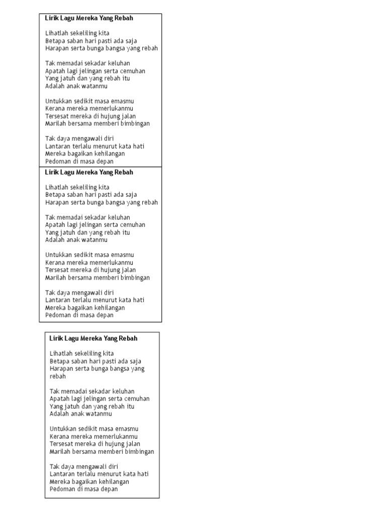 Kembali pada lagu mereka yang rebah ni. Lirik lagu dari mata sang garuda. Kita merangkak melangkah rebah Dan mahu membentuk satu kemenangan Hari ini kita berdiri teguh Dengan satu nama rupa warna berbeza.