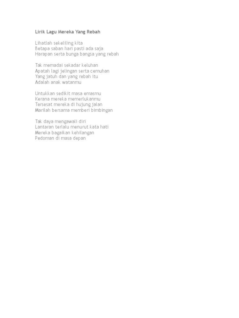 . Mereka Yang Rebah Lihatlah sekeliling kita Betapa saban hari pasti ada saja Harapan serta bunga bangsa yang rebah. Walau sepuluh ribu rebah di kananku. Awan gelap pun menghadang.